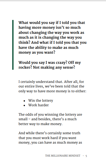 What would you say if I told you that having more money isn’t so much about changing the way you work as much as it is changing the way you think? And what if I told you that you have the ability to make as much money as you want? Would you say I was crazy? Off my rocker? Not making any sense? I certainly understand that. After all, for our entire lives, we’ve been told that the only way to have more money is to either: ●Win the lottery ●Work harder. Intrigued? Follow me on a little journey.